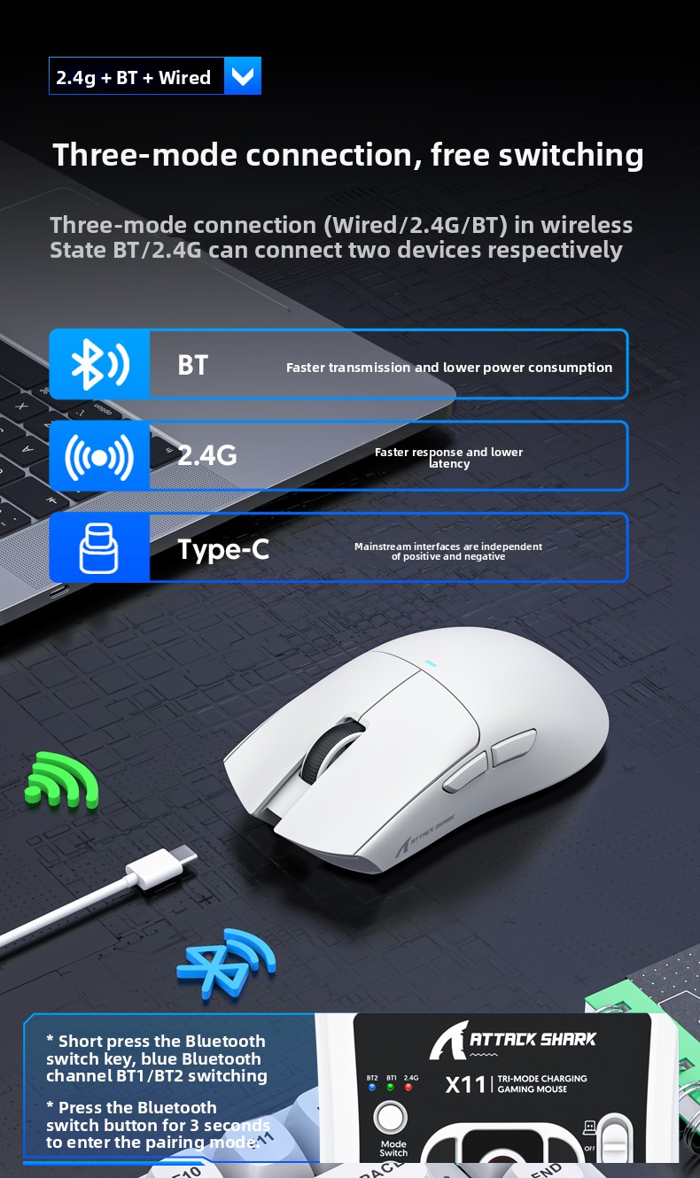 Triple Mode Connectivity: Supports 2.4GHz wireless, Bluetooth, and wired USB for versatile use across devices.